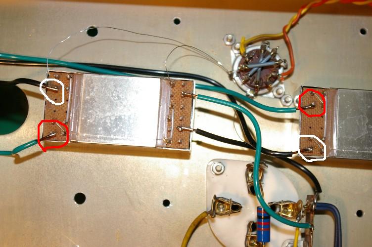 写真左のトランスの緑と黒の配線が逆に接続されています。