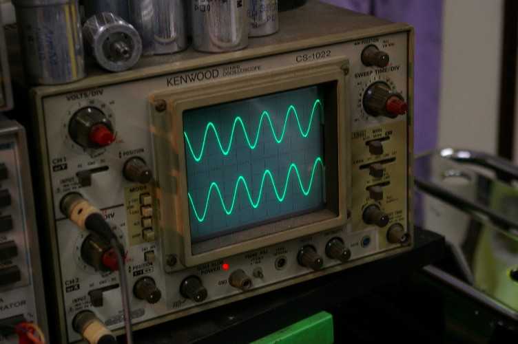 真空管が温まったところで、ボリュームを徐々に上げると正常ならオシロに波形が綺麗に映る筈ですが・・・・・・・。