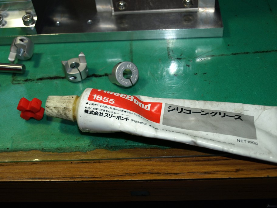 お馴染み、シリコングリス。こいつはゴムや樹脂を侵しません。見た感じでは樹脂は耐油性が有りそうですが油断大敵。