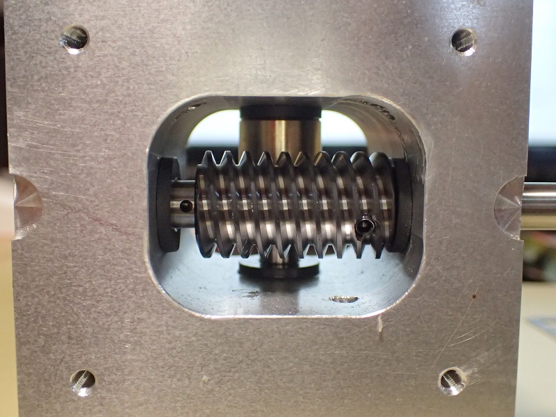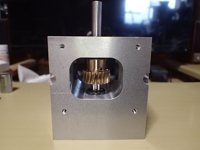 写真右側がモーターへ接続。ギヤは右側軸受けのフランジに押し付けられる形に成ります。