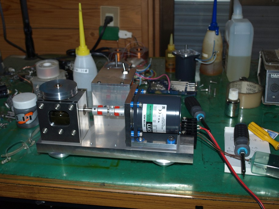 ギヤボックスの試運転。もち色々と弄っています。写真では止まって見えますがきちっと運転中(ストロボのバカ)。
