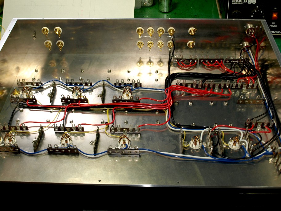 二組を右ch左chに分けて使うんですね。此れをやるとアンプ内部の配線がもの凄くし易いんです。特にプリント基板を使った場合は・・・・・・・・。