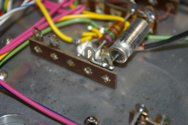 僕のアンプをひっくり返し、入力トランスを外し、結線のし直し。