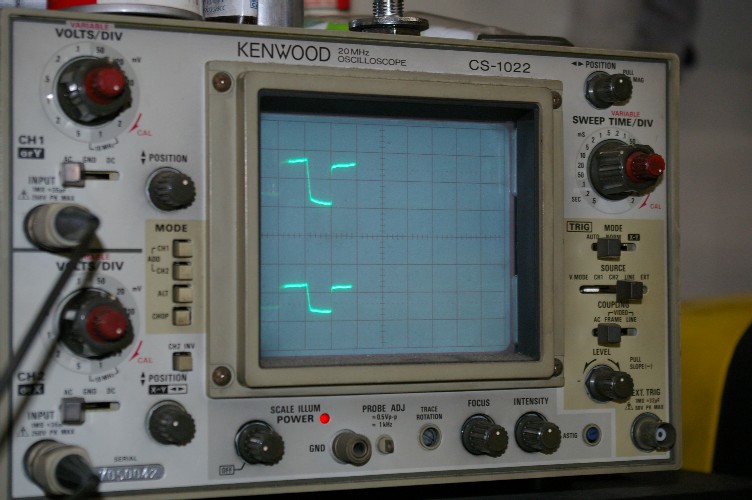 先程のオシロの波形。両ch共に同じ波形が出ています。