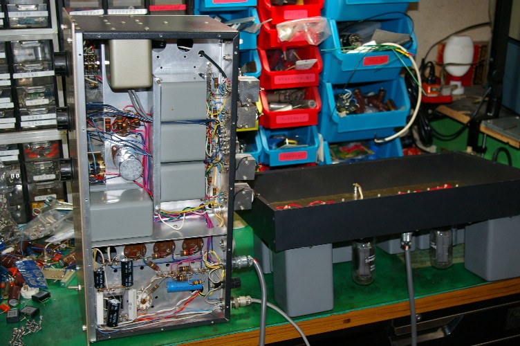 でも、トランス結合やLCRの様な高価なパーツは使わず、全段CR結合。CRイコライザー。電源トランスも1個(写真のアンプは3個)。