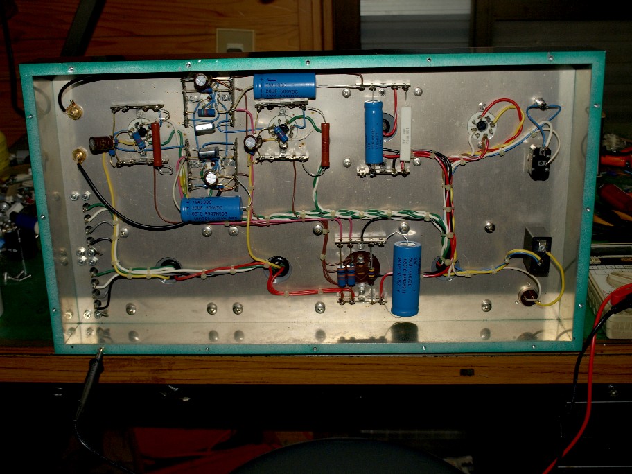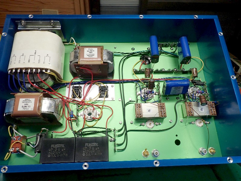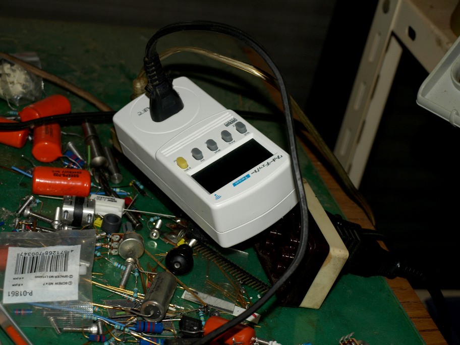 まず、整流管を挿さないで電源ON。電源トランスの端子電圧を素早く測り、パワー管のヒーターが正常に点灯しているのを確認。