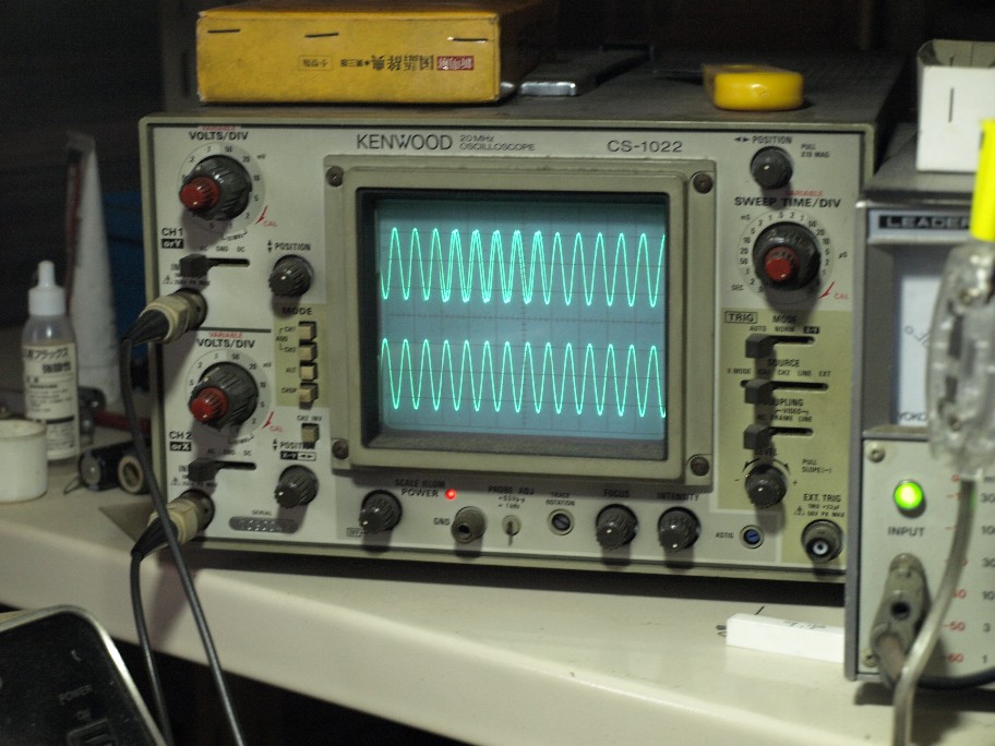 トランス二次側にはオシロを接続(ネ、トランスをキッチリ使いたかったら測定器が無くては絶対に無理。聴感で合わせると泥沼に入ります)。