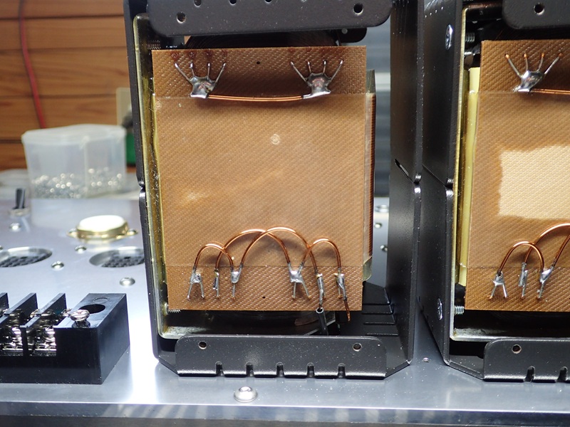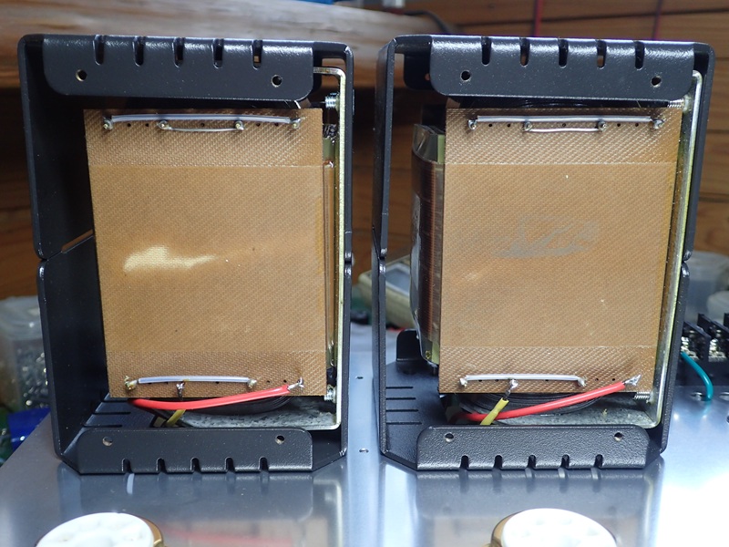 写真のケースは前面、後面共に外れる構造ですので、シャシからトランスを外さないで組み換えが出来ますが、被せてしまうケースですと、いちいちシャシからトランスを外さないと出来ません。
