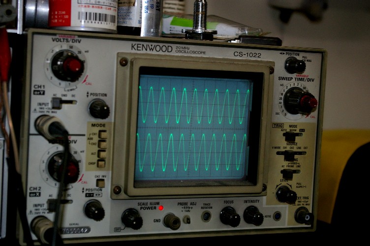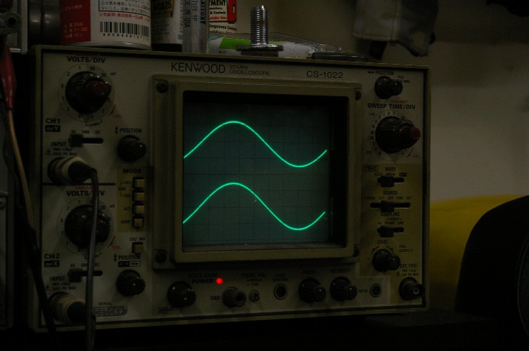 此れが狂ったら不良品。1kHzの正弦波。上が入力波形、下が出力波形。