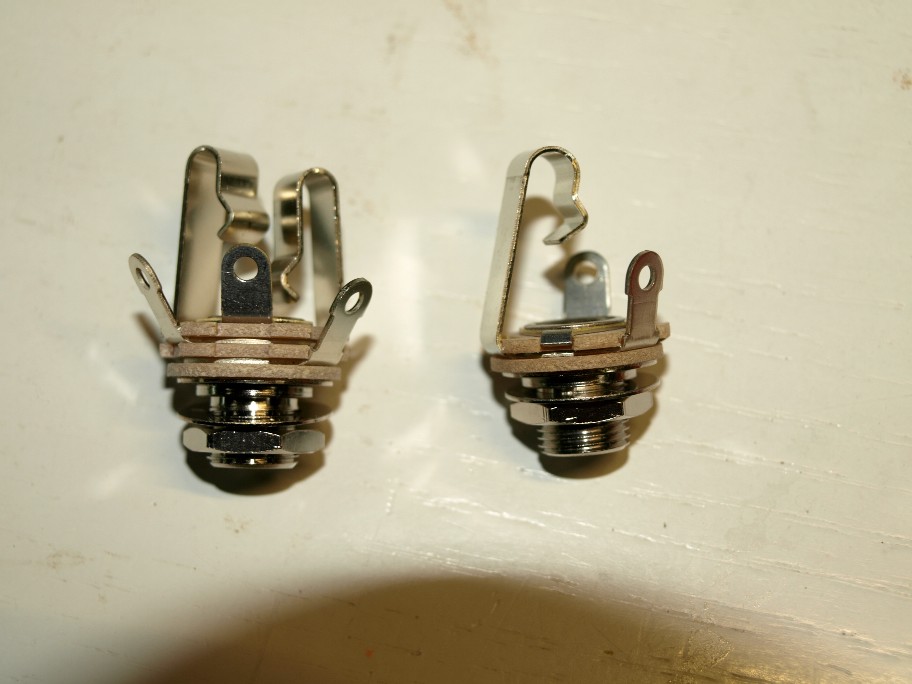 ご存知、スイッチクラフト社製のフォーンジャック。ギター用には、一般にモノラル用が使われていますが、アースラインを独立させたいのでステレオ用を使います。