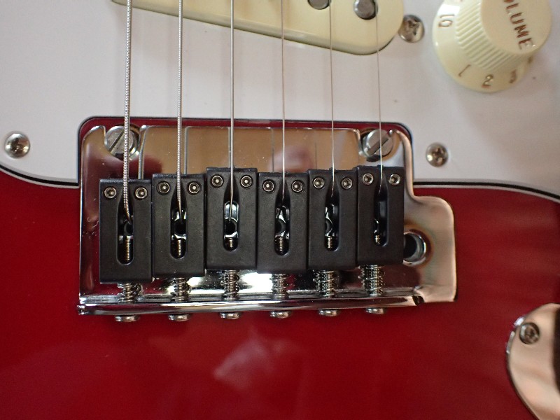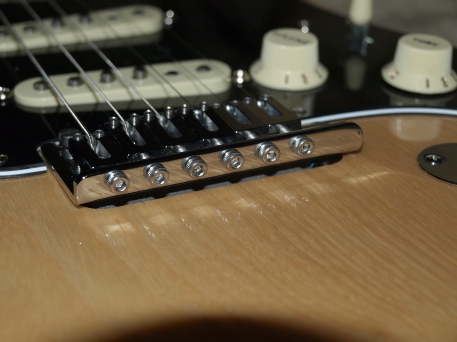 此処の部分で弦を押さえ、振動をボディ(正しくはブリッジ、ストラトの場合はトレモロユニット、其処からボディ)に伝える大切なパーツです。