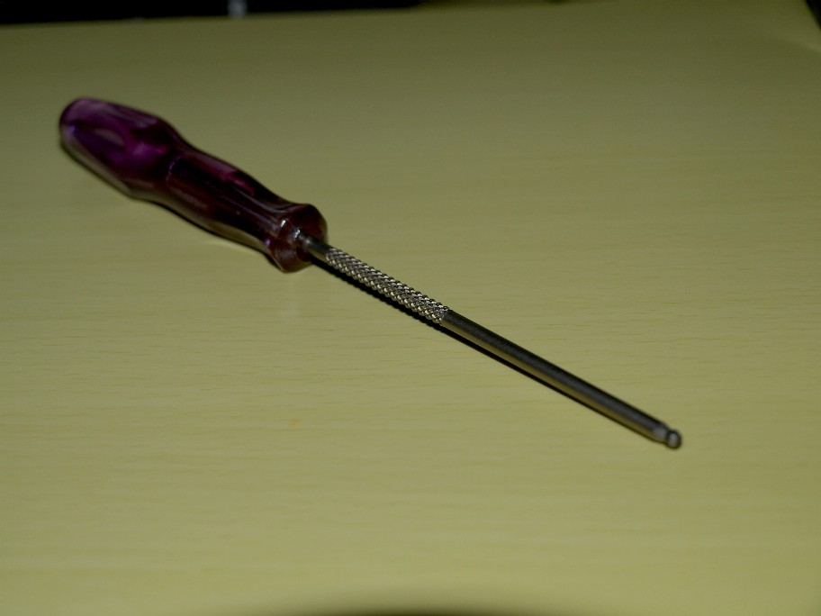 真っ直ぐにドライバーを当てると、ドライバーの柄がボディに干渉するので、傷をつけ易い。