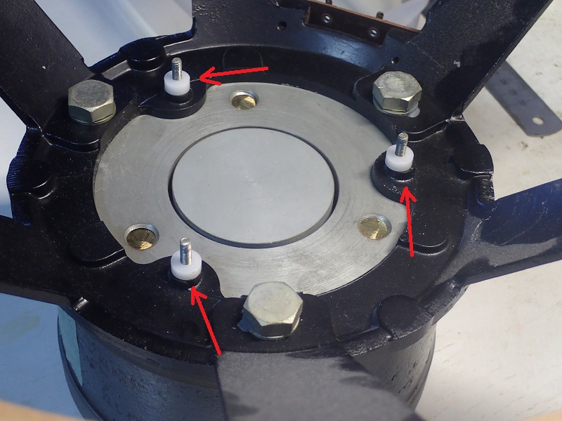 3個の矢印の先がダンパーの取り付け位置。白いカラーは僕が旋盤で挽いた一個もの。