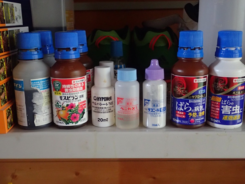 殺菌剤が6種類、殺虫剤が4種類、バラ以外に使う薬が1種類、薬を葉に固定する展着剤が1種類。