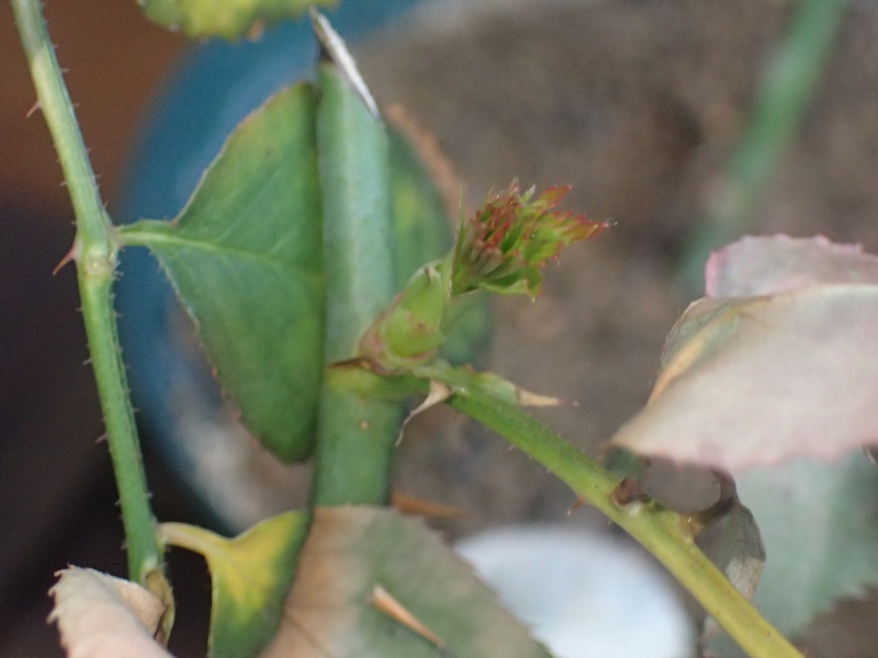 去年の12月に入って来たバラ苗5株(大き目の鉢です)の前に小さな鉢に植えて有る小さな株。