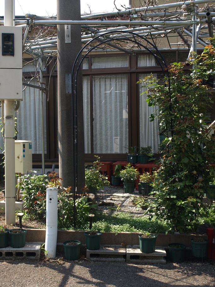 道路側から庭へ入る所にあるバラのアーチ(まだバラが育ち切っていない)。
