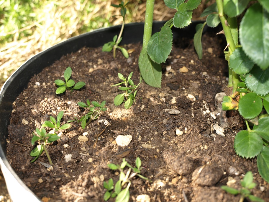 もうランナーを隣の鉢へ伸ばしています。此の侭にして置けば隣の鉢へ根付きます。根付いたら繋がっているランナーを鋏でチョッキン。