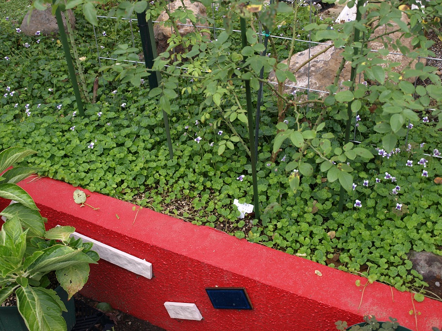 で、この二種類を使い分ける方法。日差しの強い所へはクラピア。日陰に成り易い所へはパンダスミレと言う使い分けをしています。