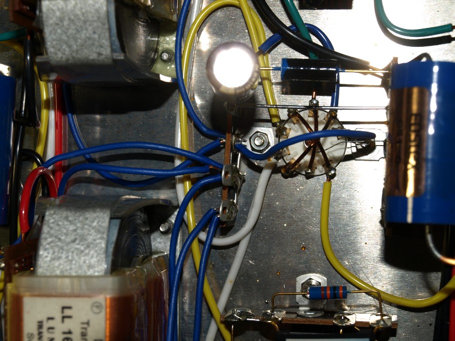 写真のラグに濃いブルーの配線が集まっていますが、この配線の先端は各真空管の9番ピン。