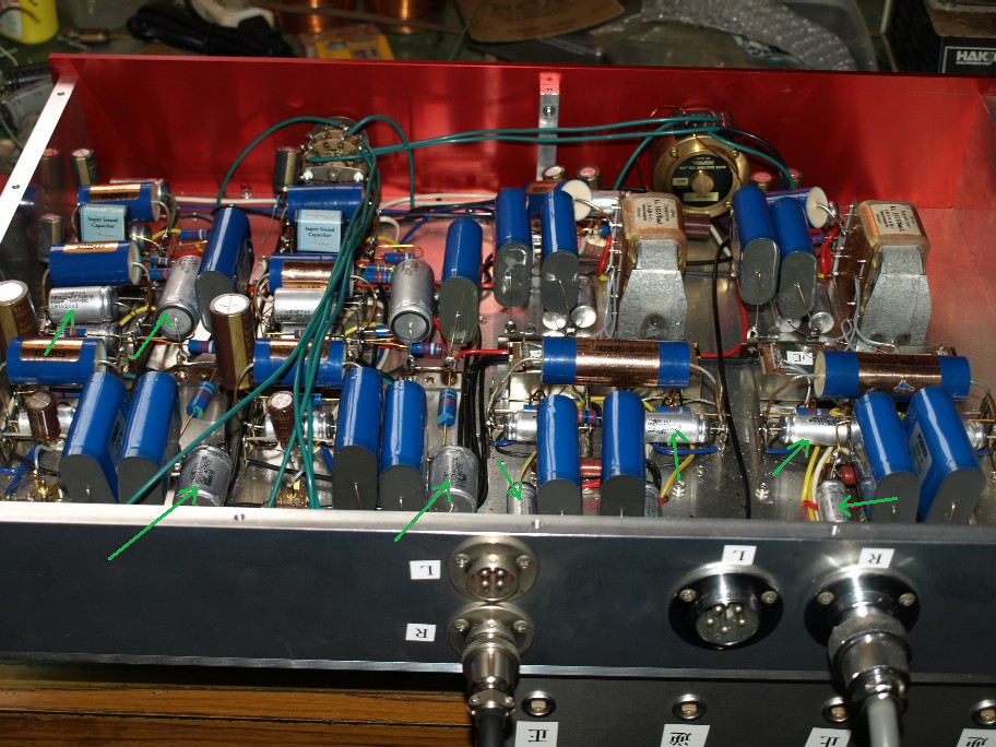 目に付くケミコンに緑の矢印を付けて見ましたが、写真で見えるのはほんの一部分です。