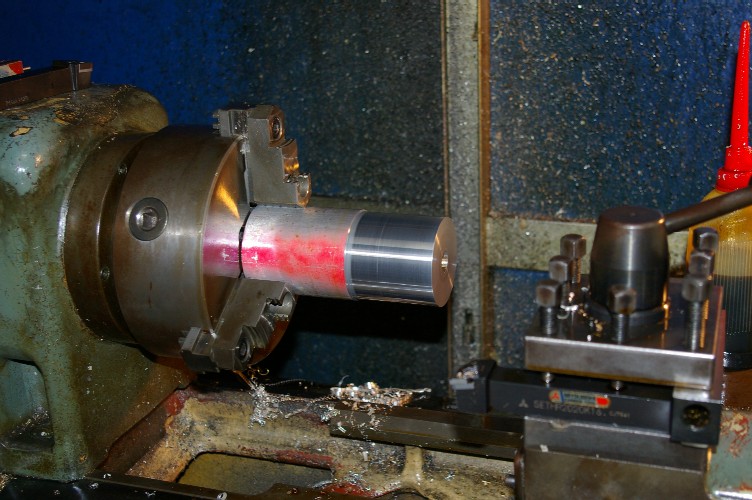 上の写真の状態は、穴径を無事に仕上げ、これから糸の掛かる溝を切るところです。