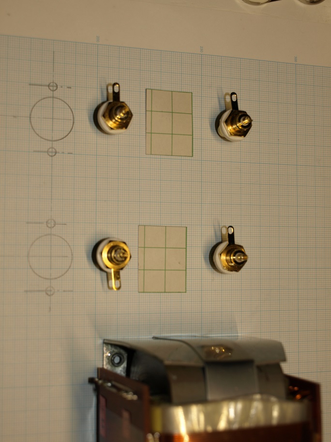 MCトランスの入荷が遅れているので、同サイズに切断した工作用紙で位置だしをしています。