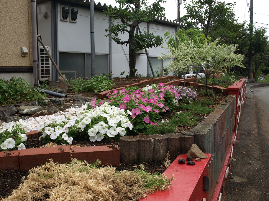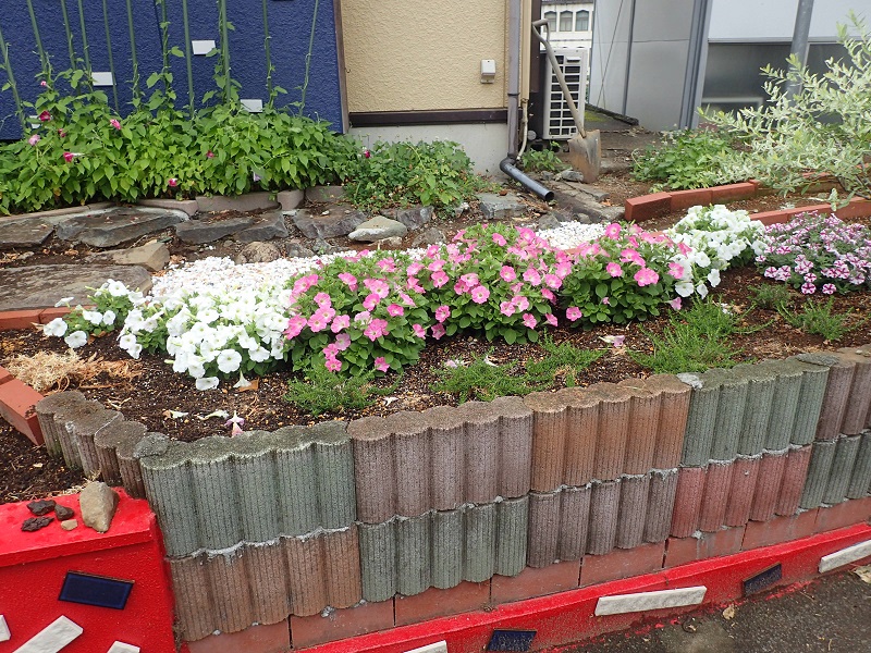 雨に弱いペチュニア。普通は鉢で育てて雨の日は軒下へ移動。
