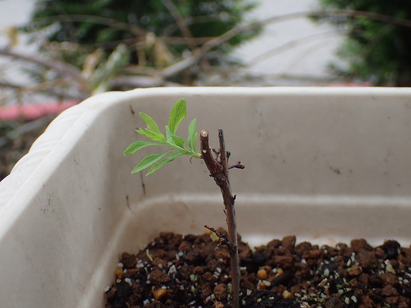 あの枯れたと思った枝からの新芽はすくすくと・・・。