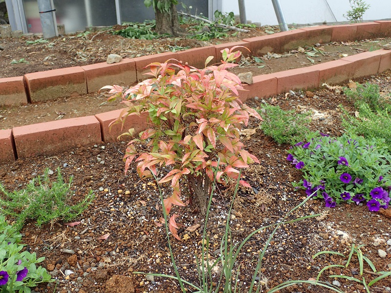 オタフクナンテン。植えたばかりなので紅葉しています。最近緑の新芽が出て来ました。