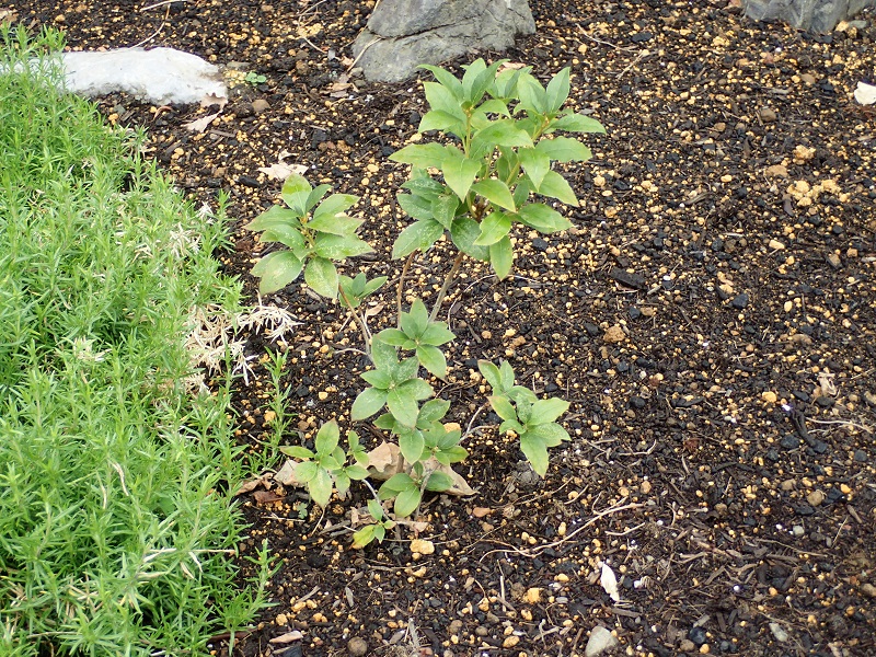 芝桜の場所へ植えた二本の玄海つつじ(白と薄ピンク)。