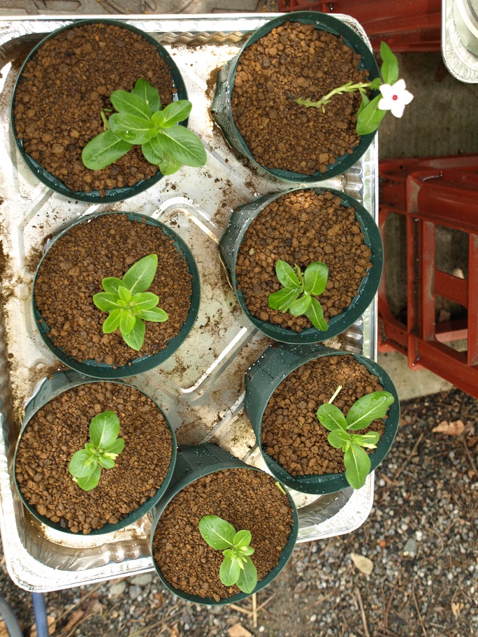日日草の挿し芽。数日前に買って来た花苗。チョイ伸び過ぎていて草体が乱れていたのです。昔なら気にしませんでしたが最近のピンキー君。メチャ気に成る。
