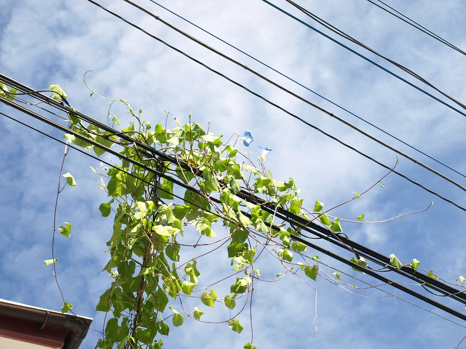 朝顔を剥がしたのは正解だったみたいです。落とした庭師さんが言うには『落とした葉の重量は10kgを超えていたと思うよ。あの状態で台風でも来たら確実にケーブルは切れたね。』