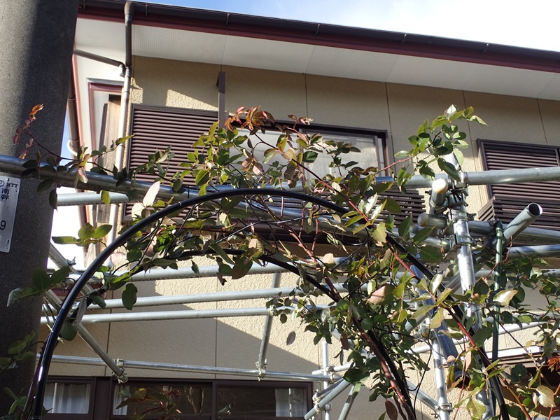 アーチの上部へ括り付けました。来春にはアーチ状に花が咲く筈なんですけど・・・(初めての経験なので判らない)。
