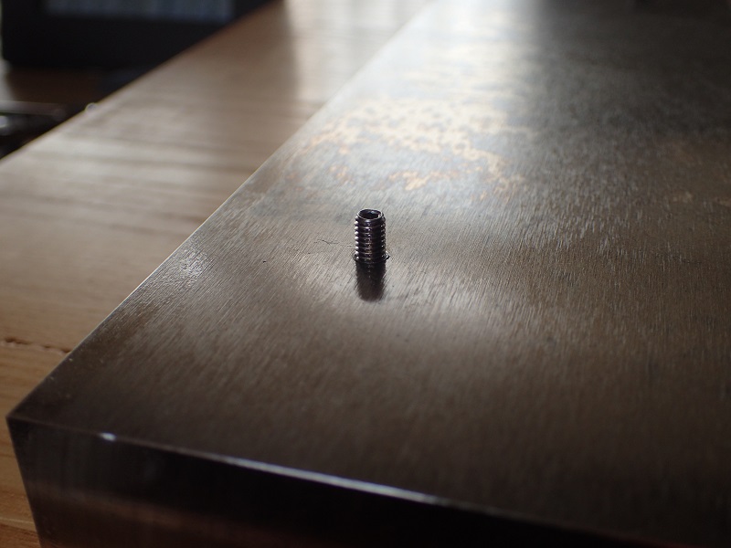 ティップトゥーを取り付けるイモネジ(M4×15)。ネジ穴が垂直に開いていませんとティップトゥーが斜めに成ります。