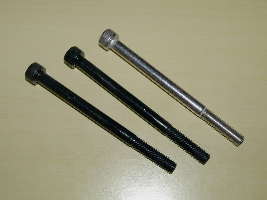 黒い2本が着色加工品。着色と言っても塗装では有りません。ネジ山に塗装をしたら・・・・(汗)。