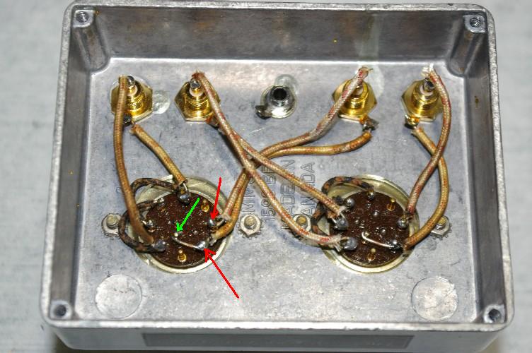 グリーンの矢印の端子は、トランス内部のシールドとコアからの配線が繋がっています。