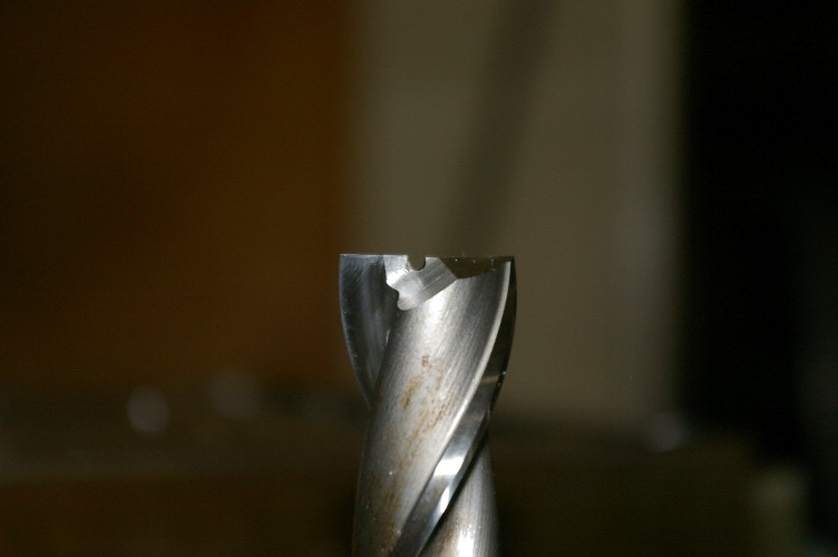 この写真が標準のエンドミル。穴あけから切削まで万能に働きます。