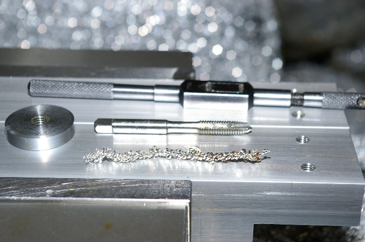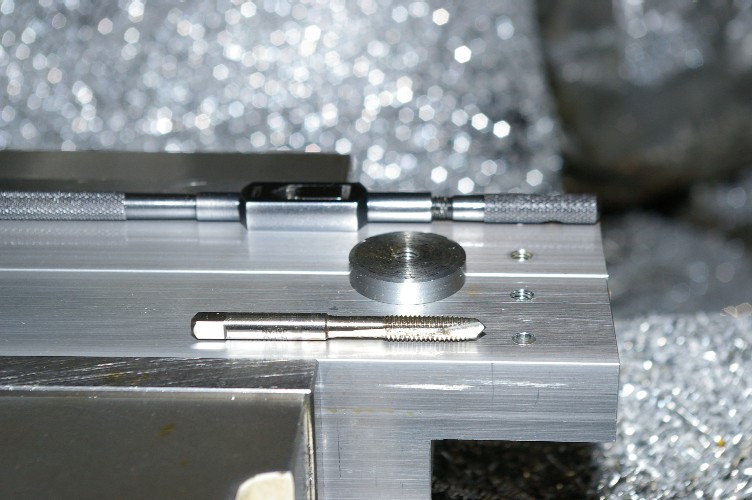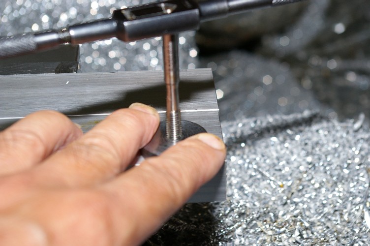 タップの先端が下へ押し出され、下穴の中心に冶具の位置が修正され、更に廻すと材料にタップが食い込んできます。