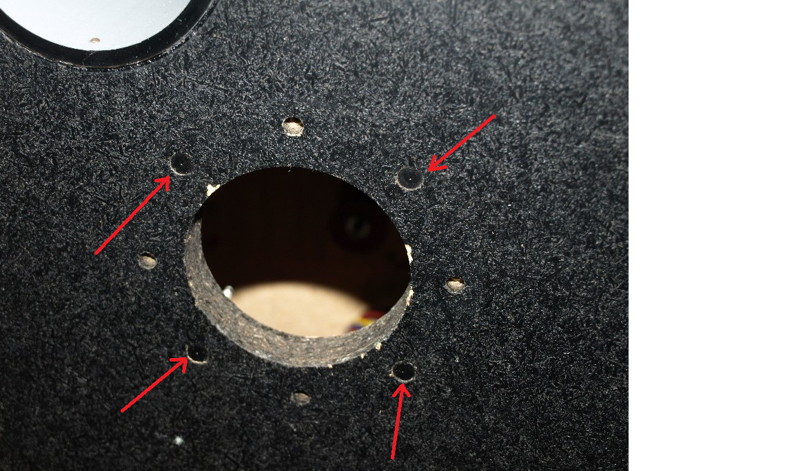 矢印のボルト(M4)4本をバッフル前面から突き通しスタッド状態で使っています。