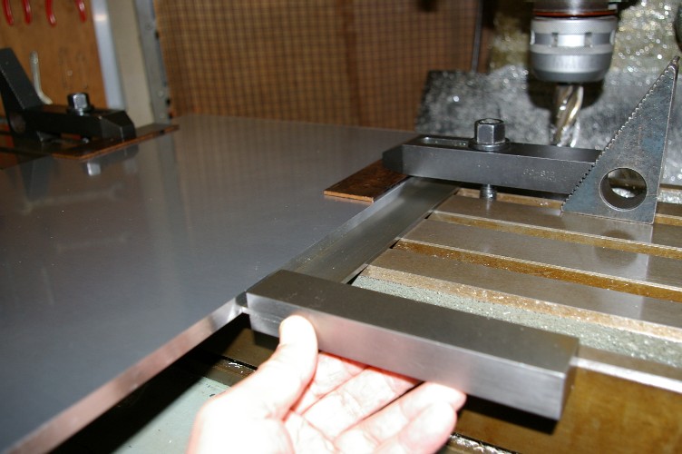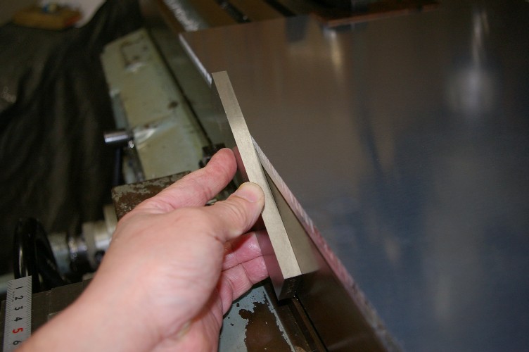 此処にアルミ板の端を合わせます。平面をシッカリと出した金属をあてがい、取り付け位置を合わせます。