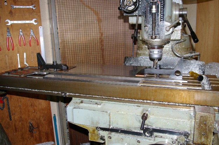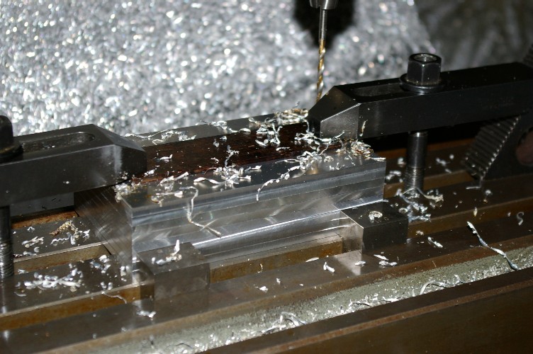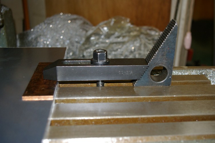 短手の切削ですが、此処で問題。長手と短手の直角度の問題です。長手を平行には簡単ですが(同じ工程を二度すれば良い)直角を出すにはちょいと頭を使います。答えは上の写真スコヤ(直角定規)を使って切削の終った長手とベッドの直角を出しベッドに固定します。でもこの固定が難しい。