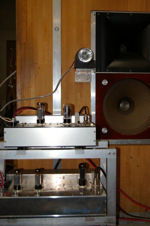 只今のパワーアンプの状態。全帯域、EL34三結シングル。
