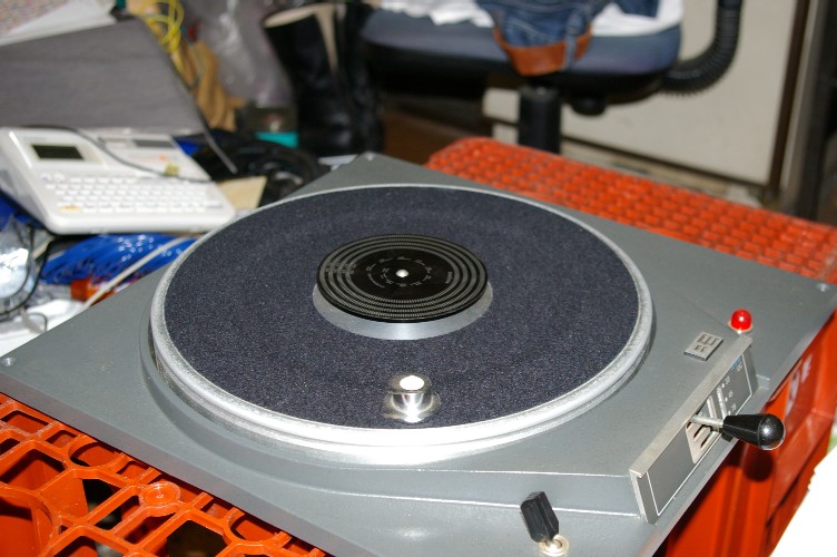 ターンテーブルにマークに成る物を置き、100回転数えながら、ストップウォッチで時間を計ります。
