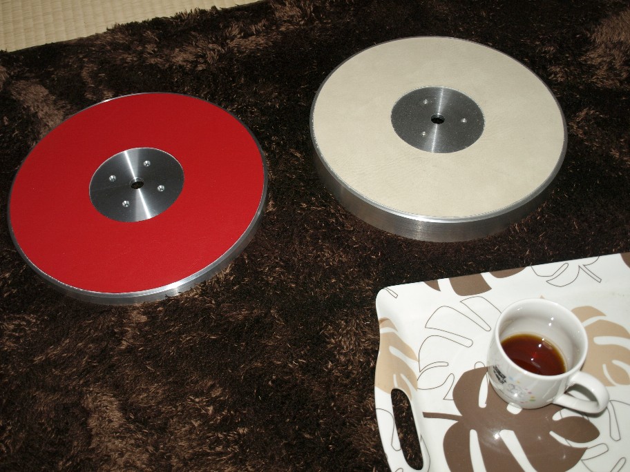 色々な話をしながらフラットターンテーブルの軽量穴の開いている物と穴無しを聞き比べ。