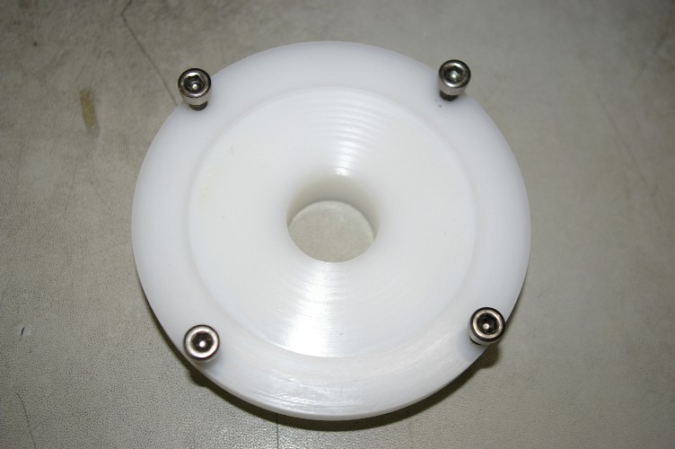 で、下側の中心に穴を開ける為の冶具です。此れにモーターを取り付けてから旋盤に咥え、お尻に穴を開けるのです。