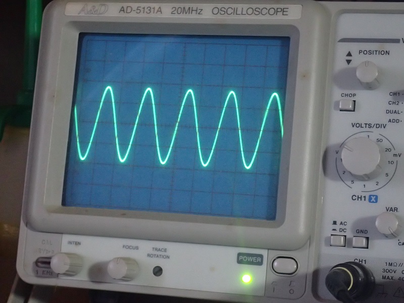 勿論、発信機から正弦波を入れて、出力端子にダミー抵抗を取り付け、その抵抗の両端の波形を観測します。