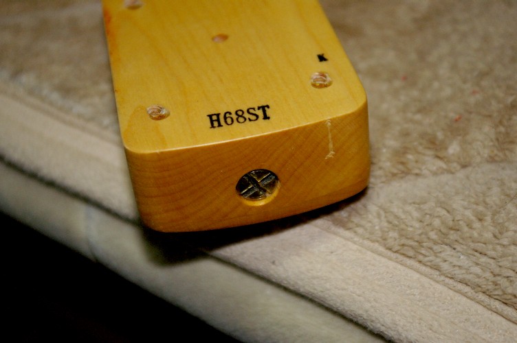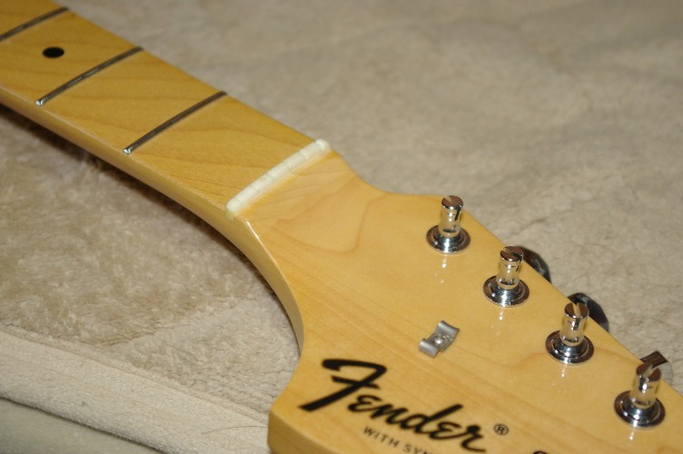 此のストラト。ネック先端に調整穴が開いていません。