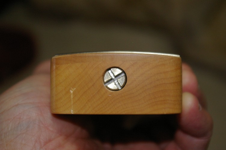 中心の穴を使い、木ネジでヘッドへ取り付け、両側のアールのついた溝で弦を押さえます。