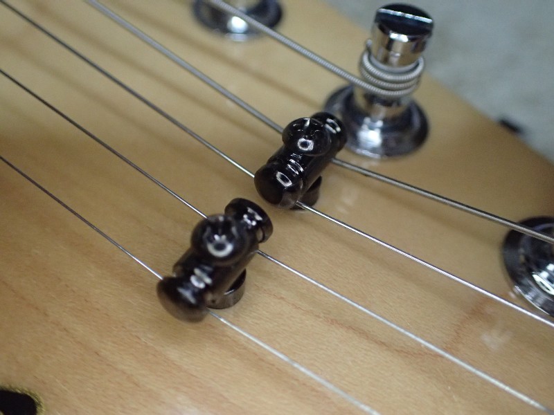 何も無ければ更に2番弦、更に1番弦の方が弱いのですが、ストリングガイドと言うパーツを使って、1,2番弦は弦の角度を調整して、ナットへの圧力を強めています。