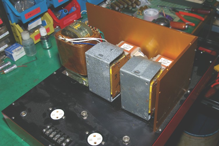 ケースの無いトランスを全面に採用した初めてのアンプの為、シャシに気合いが入り過ぎ。